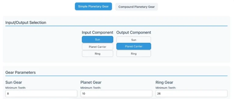 Design your planetary gear speed reducer with this tool. Input your desired target ratio, add any constraints your design needs to meet, and the algorithm will generate a range of possible combinations that meet your specifications.