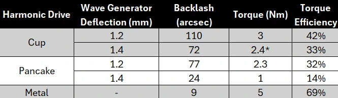 We can also note that the metal harmonic drive is much more efficient, which is expected due to lower friction and tighter manufacturing tolerances.